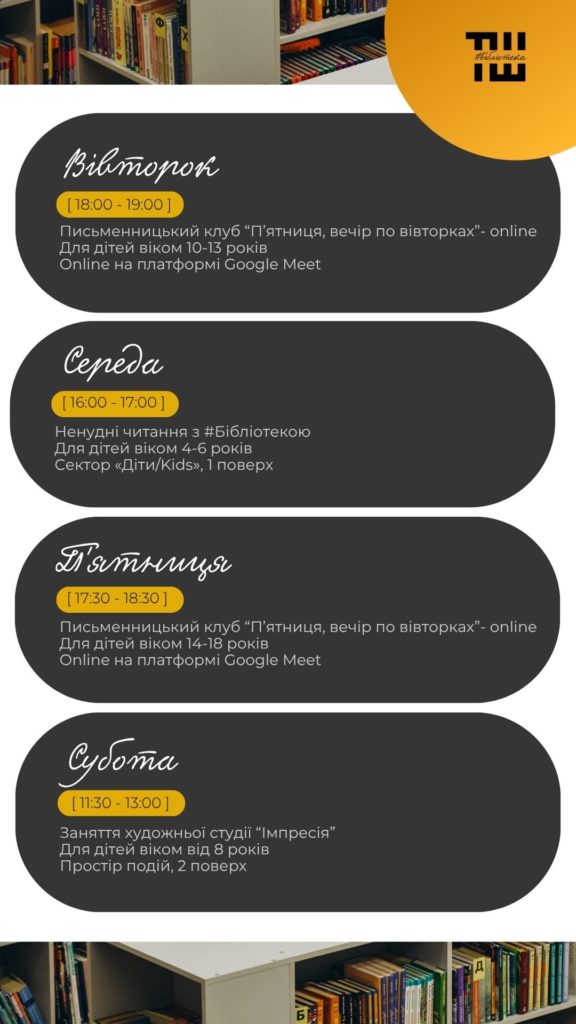 Друзі, для зручності додаємо інформацію про активності, що відбуваються у #Бібліотеці на постійній основі